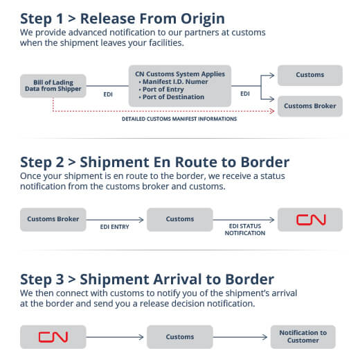 CN connects directly with Canada Border Services Agency (CBSA) Accelerated Commercial Release Operations Support System (ACROSS), transmitting manifest details electronically on transborder shipments. Similar to the CBP process, CN transmits the data prior to train arrival at the border for preprocessing by CBSA in order to ensure expedited train movement and shipment release across the border. CN’s electronic link with CBSA allows for release statuses of transborder shipments and ocean to rail shipments to be instantly available to customers.