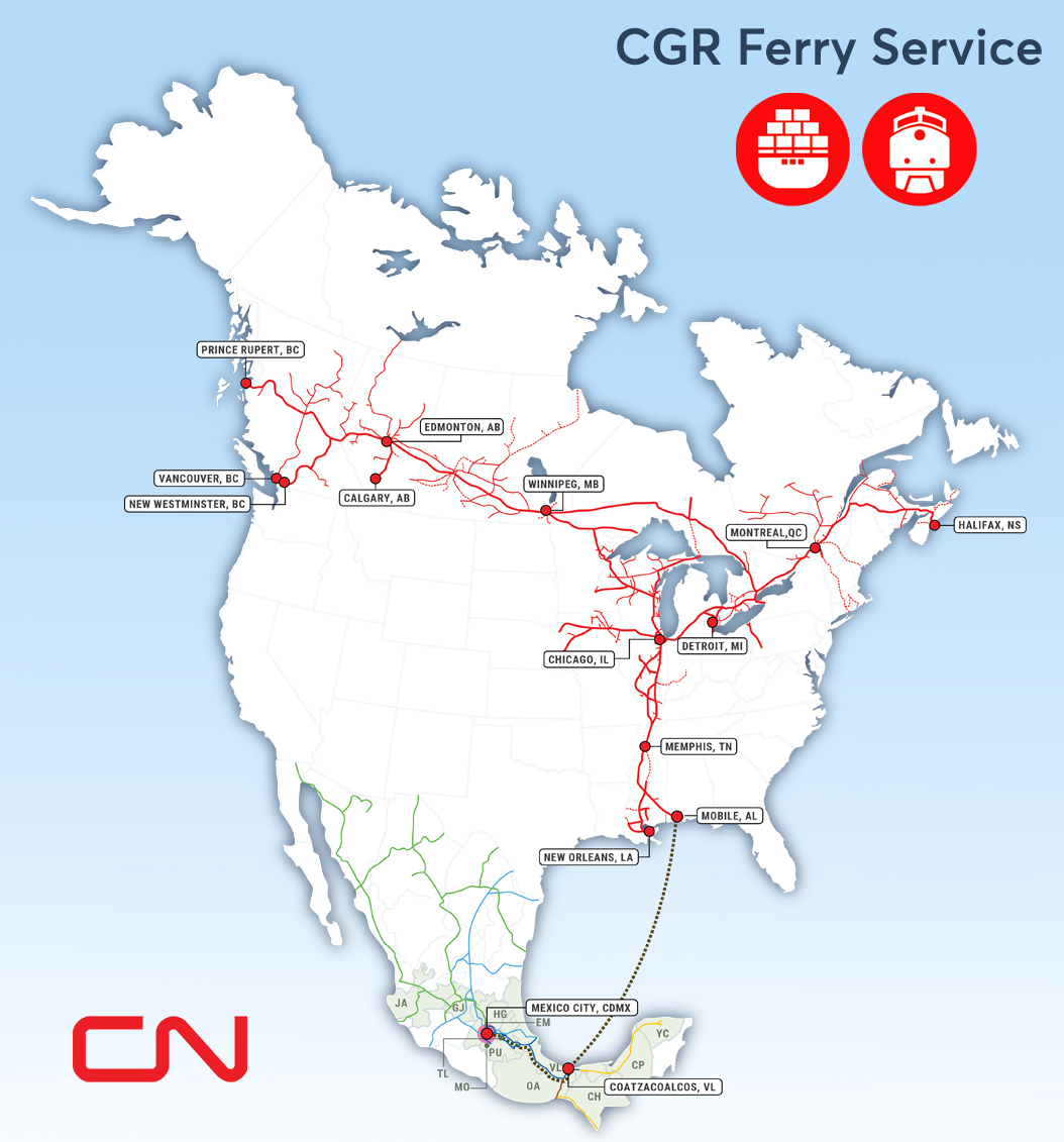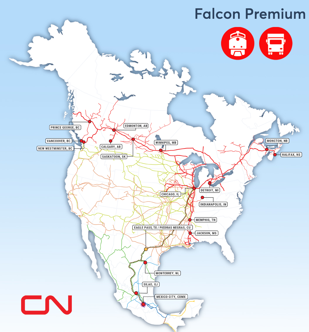 • Service moves between all CN Canadian Terminals, Detroit and FXE terminals located in Silao, GJ, Monterrey, NL and newly-added Pantaco ramp (Mexico City)